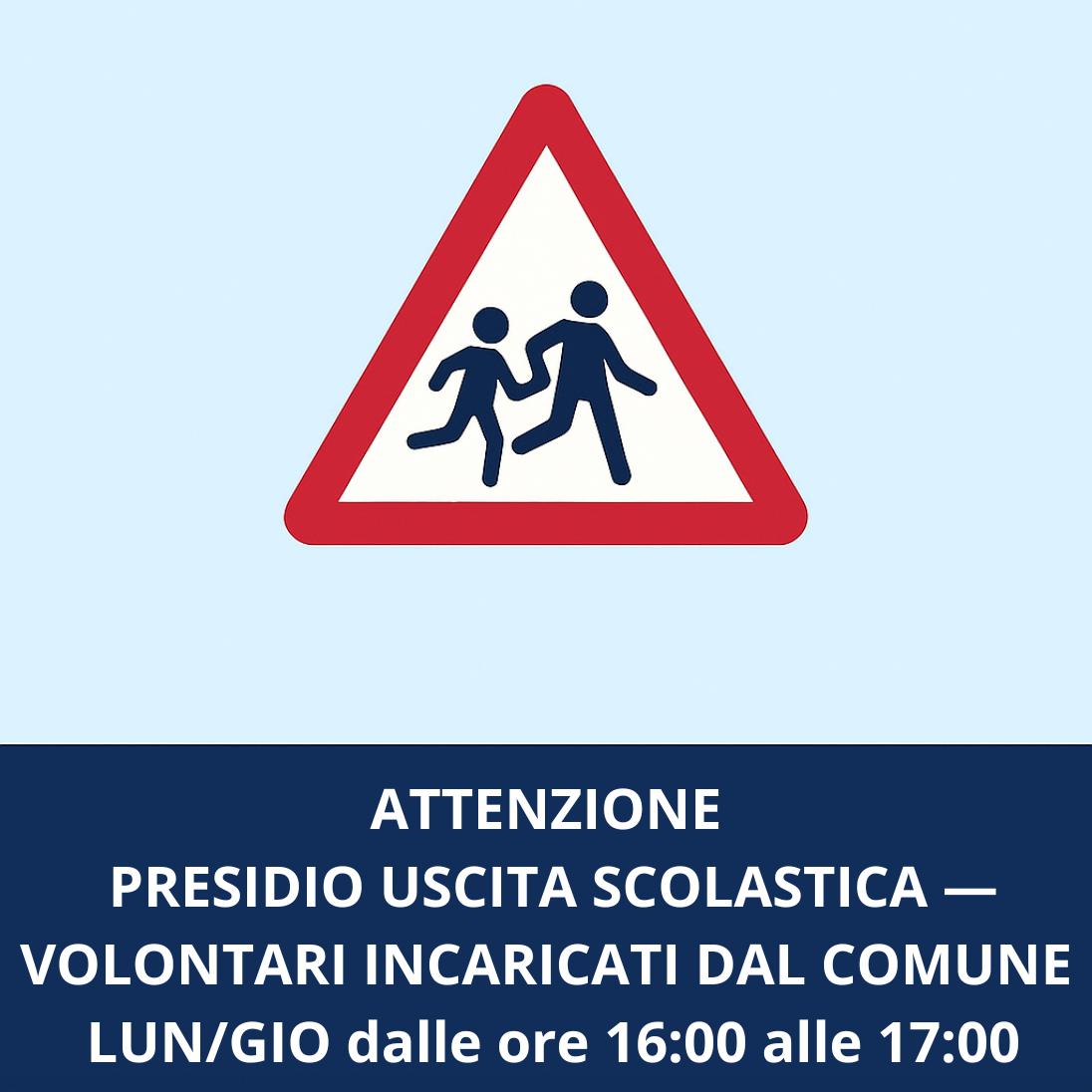 Si informa che, a decorrere da lunedì 27 ottobre 2025, il Comune di Terruggia ha disposto la presenza di volontari incaricati per il presidio delle uscite scolastiche. Tale servizio sarà attivo nei seguenti orari: lunedì pomeriggio e giovedì pomeriggio dalle ore 16:00 alle ore 17:00.